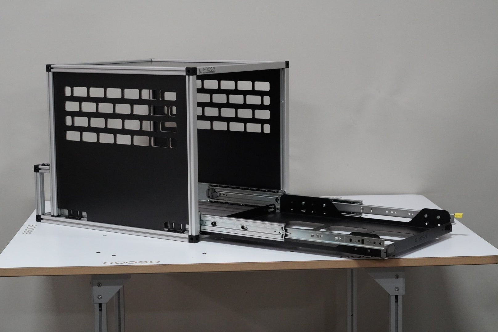 The Goose Gear IceBox 1.51 contains a complete fridge slide integrated into a Goose Gear Module. It features a 100% extension fridge tray with Lock-In/Lock-Out capability. With the Goose Gear IceBox, you can safely store gear on top of your fridge and still have complete access without having to unload your gear to access your food.